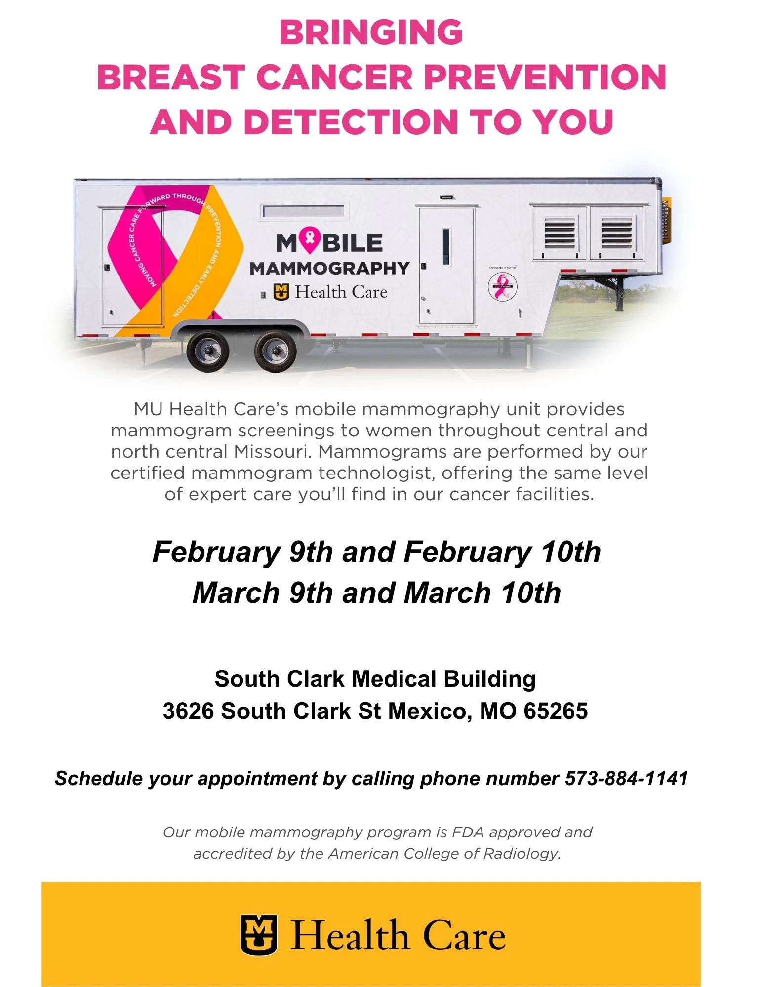 MU Health Careโs mobile mammography unit is bringing expert breast cancer screening directly to our community. Screenings are performed by a certified mammogram technologist, offering the same high-quality care youโll find in MU Health Care cancer facilities.
