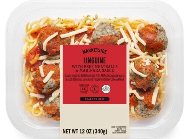 12-oz. clear plastic tray packages labeled “MARKETSIDE LINGUINE WITH BEEF MEATBALLS & MARINARA SAUCE” with “best if used by” dates SEP 22, 2025; SEP 24, 2025; SEP 25, 2025; SEP 29, 2025; SEP 30, 2025; and OCT 01, 2025.